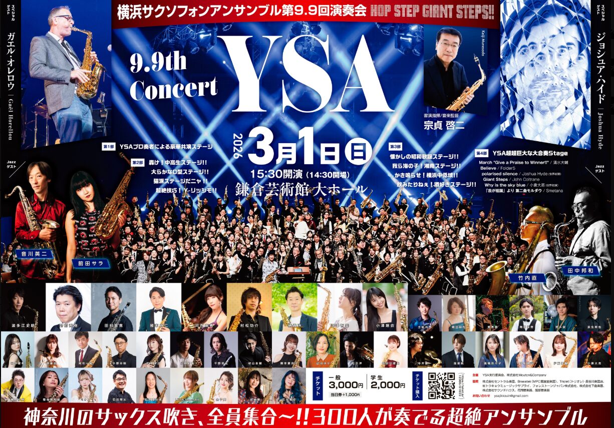 3/1(日)YSA横浜サクソフォンアンサンブル第9.9回演奏会に長谷川楽器店さんと合同で協賛出展します。 2026.02.08 イベント 日時:2027年 3月 1日(日)14:30開場、15:30開演 会場:鎌倉芸術館大ホール 開演前、休憩時に試奏できます。 URL Copied!